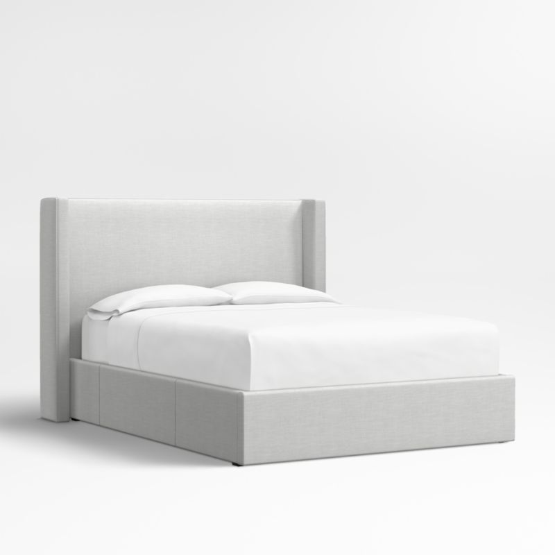Our custom bed collection lets you mix and match our top-selling headboards and bases for a look that's truly yours. Fully upholstered in a cool grey linen blend, our Arden headboard and storage base are amply padded and neatly tailored with topstitching. The shelter headboard with wingback contours and comfy padding wraps onto the base, which integrates three roomy drawers—one on each side and one at the foot of the bed—for storing off-season clothes and extra blankets. As a plus, the side drawers open with just enough clearance to avoid hitting nightstands and other bedroom furniture.