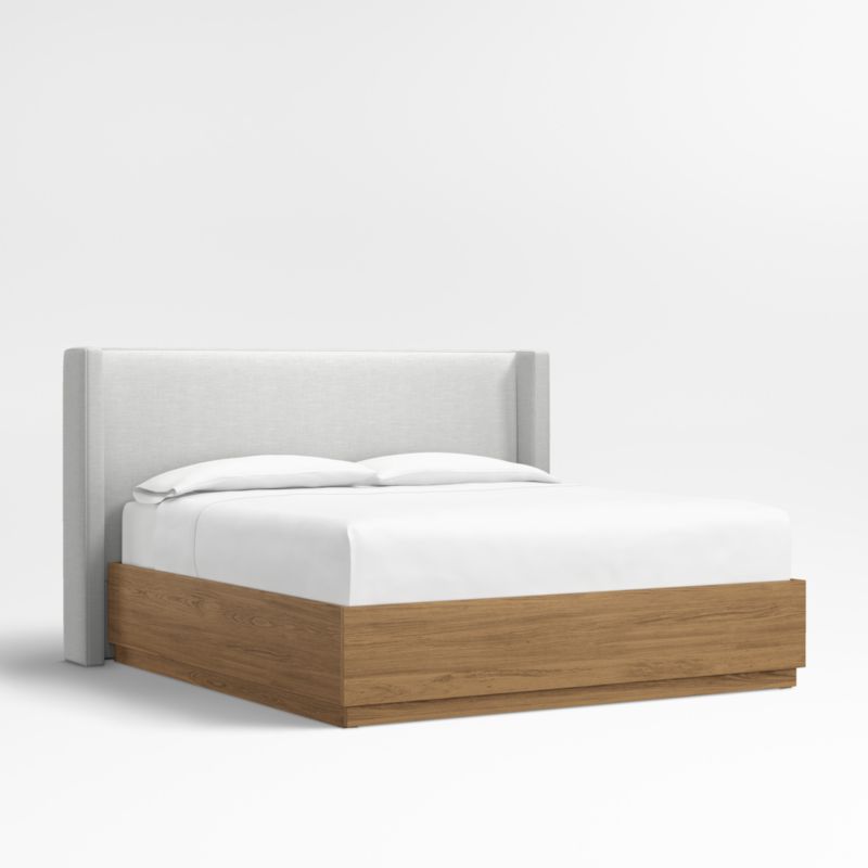 Our custom bed collection lets you mix and match our top-selling headboards and bases for a look that's truly yours. Upholstered in a cool grey linen blend with topstitched detailing, the Arden shelter headboard surrounds with wingback contours and comfy padding. The headboard wraps onto the Batten bed base, which complements Arden's tailored curves with a sleek plinth design and the lively grain of oak veneer enhanced with a smoke grey finish. A great choice for storage-challenged bedrooms, Batten seamlessly integrates a drawer at the foot of the base for placing bedding, blankets and out-of-season garments.