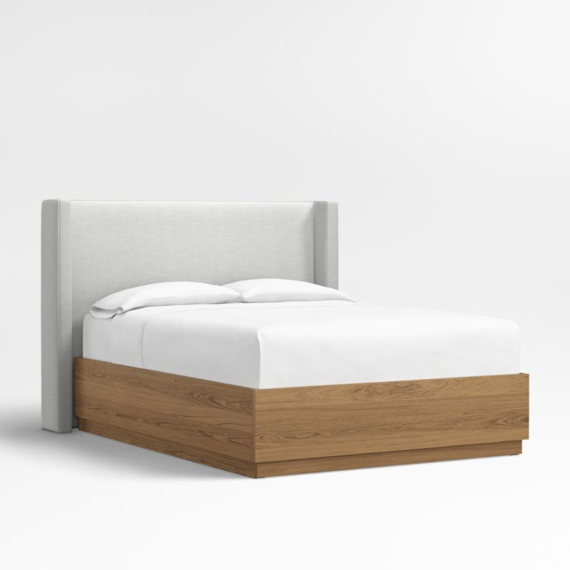 Our custom bed collection lets you mix and match our top-selling headboards and bases for a look that's truly yours. Upholstered in a cool grey linen blend with topstitched detailing, the Arden shelter headboard surrounds with wingback contours and comfy padding. The headboard wraps onto the Batten bed base, which complements Arden's tailored curves with a sleek plinth design and the lively grain of oak veneer enhanced with a smoke grey finish. A great choice for storage-challenged bedrooms, Batten seamlessly integrates a drawer at the foot of the base for placing bedding, blankets and out-of-season garments.