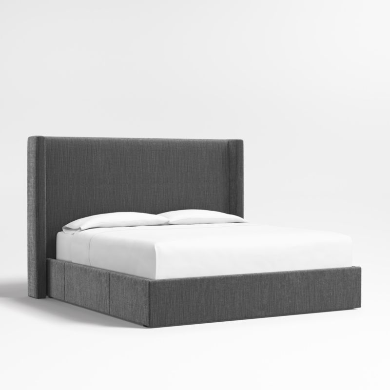 Our custom bed collection lets you mix and match our top-selling headboards and bases for a look that's truly yours. Fully upholstered in a textured weave in charcoal grey, our Arden headboard and storage base are amply padded and neatly tailored with topstitching. The tall shelter headboard with wingback contours and comfy padding wraps onto the base, which integrates three roomy drawers—one on each side and one at the foot of the bed—for storing off-season clothes and extra blankets. As a plus, the side drawers open with just enough clearance to avoid hitting nightstands and other bedroom furniture.
