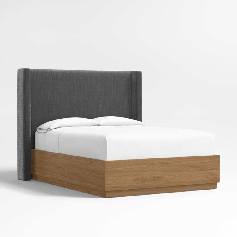 Our custom bed collection lets you mix and match our top-selling headboards and bases for a look that's truly yours. Upholstered in a charcoal grey textured weave with topstitched detailing, our Arden tall shelter headboard surrounds with wingback contours and comfy padding. The headboard wraps onto the Batten bed base, which complements Arden's tailored curves with a sleek plinth design and the lively grain of oak veneer enhanced with a smoke grey finish.