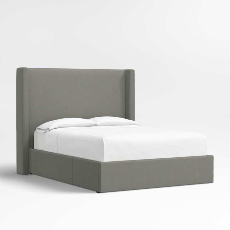 Our custom bed collection lets you mix and match our top-selling headboards and bases for a look that's truly yours. Fully upholstered in a graphite grey linen blend, our Arden headboard and storage base are amply padded and neatly tailored with topstitching. The tall shelter headboard with wingback contours and comfy padding wraps onto the base, which integrates three roomy drawers—one on each side and one at the foot of the bed—for storing off-season clothes and extra blankets. As a plus, the side drawers open with just enough clearance to avoid hitting nightstands and other bedroom furniture.