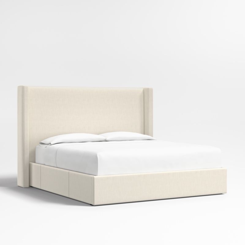 Our custom bed collection lets you mix and match our top-selling headboards and bases for a look that's truly yours. Fully upholstered in an ivory linen blend, our Arden headboard and storage base are amply padded and neatly tailored with topstitching. The tall shelter headboard with wingback contours and comfy padding wraps onto the base, which integrates three roomy drawers—one on each side and one at the foot of the bed—for storing off-season clothes and extra blankets. As a plus, the side drawers open with just enough clearance to avoid hitting nightstands and other bedroom furniture.
