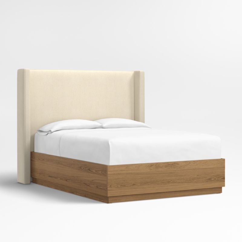 Our custom bed collection lets you mix and match our top-selling headboards and bases for a look that's truly yours. Fully upholstered in a soft bouclé weave in decor-friendly ivory, the Arden shelter headboard surrounds with wingback contours and comfy padding. The tall headboard wraps onto the Batten bed base, which complements Arden's tailored curves with a sleek plinth design and the lively grain of oak veneer enhanced with a smoke grey finish. A great choice for storage-challenged bedrooms, Batten seamlessly integrates a drawer at the foot of the base for placing bedding, blankets and out-of-season garments.