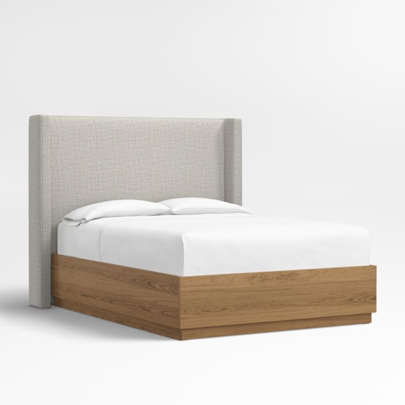 Our custom bed collection lets you mix and match our top-selling headboards and bases for a look that's truly yours. Fully upholstered in a textured weave in misty grey, the tall shelter headboard surrounds with wingback contours and comfy padding. The headboard wraps onto the Batten bed base, which complements Arden's tailored curves with a sleek plinth design and the lively grain of oak veneer enhanced with a smoke grey finish.