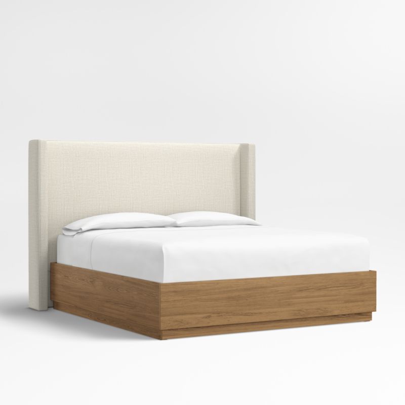 Our custom bed collection lets you mix and match our top-selling headboards and bases for a look that's truly yours. Upholstered in a beige textured weave with topstitched detailing, the Arden tall shelter headboard surrounds with wingback contours and comfy padding. The headboard wraps onto the Batten bed base, which complements Arden's tailored curves with a sleek plinth design and the lively grain of oak veneer enhanced with a smoke grey finish. A great choice for storage-challenged bedrooms, Batten seamlessly integrates a drawer at the foot of the base for placing bedding, blankets and out-of-season garments.