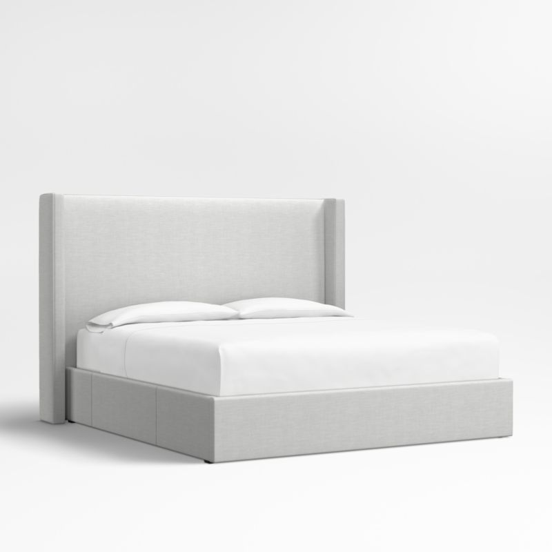 Our custom bed collection lets you mix and match our top-selling headboards and bases for a look that's truly yours. Fully upholstered in a warm grey linen blend, our Arden headboard and storage base are amply padded and neatly tailored with topstitching. The tall shelter headboard with wingback contours and comfy padding wraps onto the base, which integrates three roomy drawers—one on each side and one at the foot of the bed—for storing off-season clothes and extra blankets. As a plus, the side drawers open with just enough clearance to avoid hitting nightstands and other bedroom furniture.