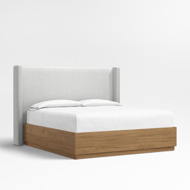 Our custom bed collection lets you mix and match our top-selling headboards and bases for a look that's truly yours. Upholstered in a warm grey linen blend with topstitched detailing, our Arden tall headboard surrounds with wingback contours and comfy padding. The headboard wraps onto the Batten bed base, which complements Arden's tailored curves with a sleek plinth design and the lively grain of oak veneer enhanced with a smoke grey finish. A great choice for storage-challenged bedrooms, Batten seamlessly integrates a drawer at the foot of the base for placing bedding, blankets and out-of-season garments.