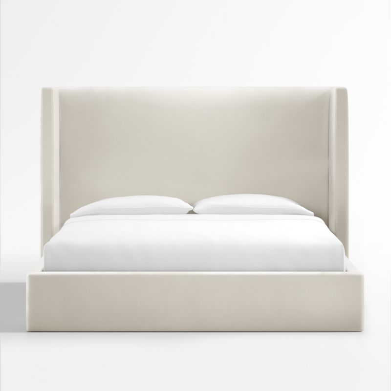 Our Arden bed shelters you within its luxe, fully upholstered contours. The statuesque headboard squares the traditional wingback silhouette with right angles, accentuating the bed's dramatic proportions and clean lines. Topstitching lends a tailored look to soft, mohair-like fabric in neutral beige. The Arden upholstered bed with tall headboard is a Crate & Barrel exclusive.