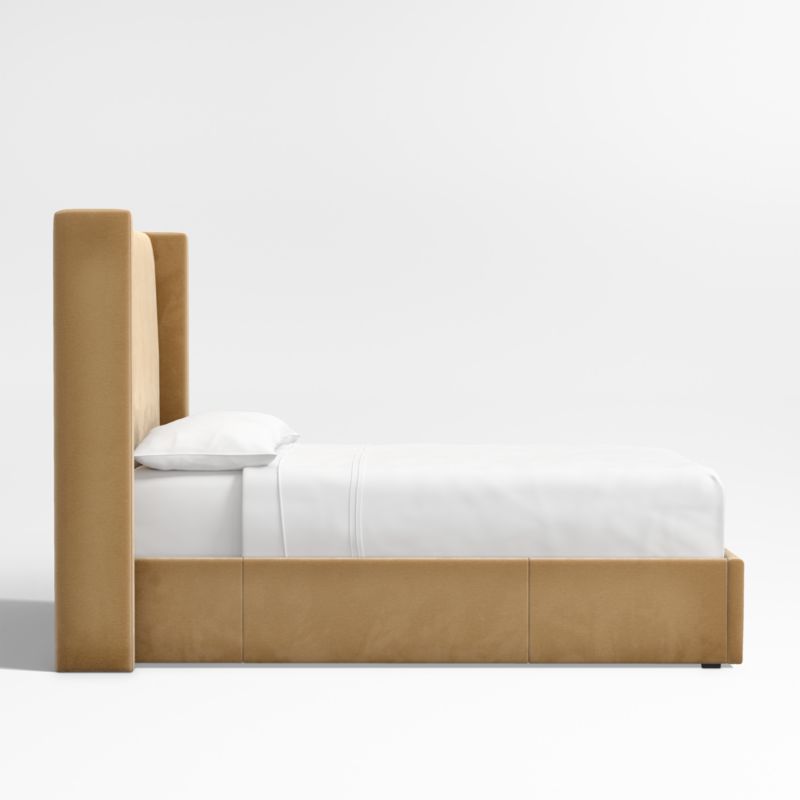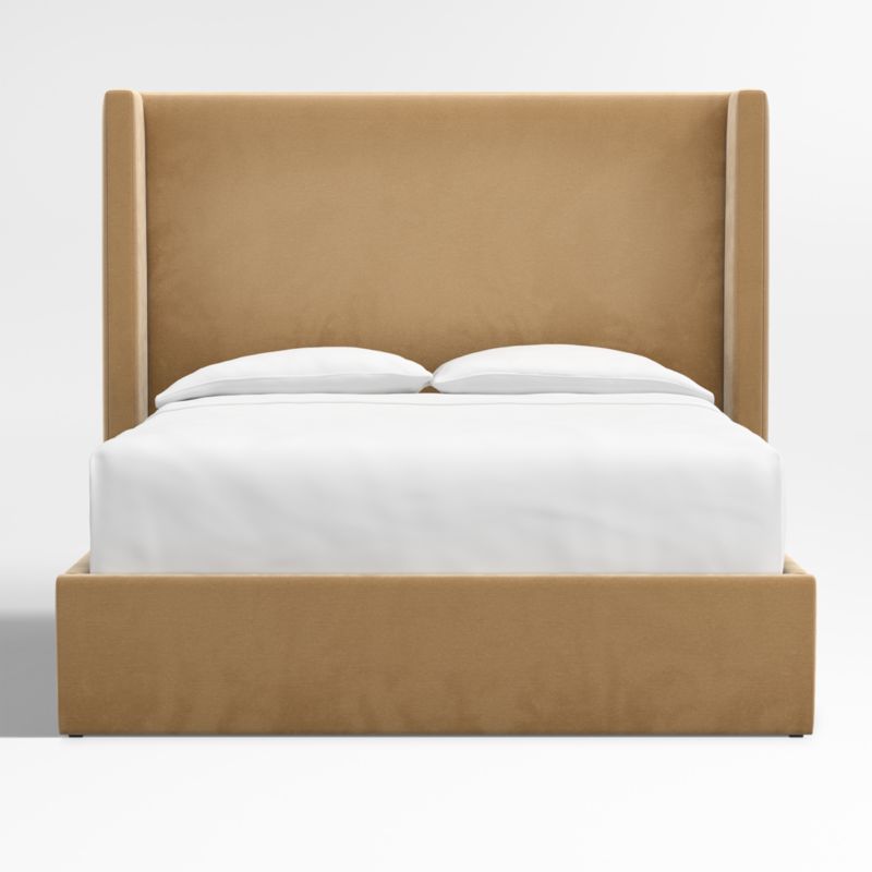 Our custom bed collection lets you mix and match our top-selling headboards and bases for a look that's truly yours. Fully upholstered in plush camel brown faux mohair, our Arden headboard and storage base are amply padded and neatly tailored with topstitching. The tall shelter headboard with wingback contours and comfy padding wraps onto the base, which integrates three roomy drawers—one on each side and one at the foot of the bed—for storing off-season clothes and extra blankets. As a plus, the side drawers open with just enough clearance to avoid hitting nightstands and other bedroom furniture.