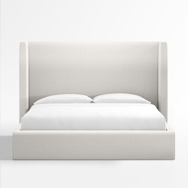 Our Arden bed shelters you within its luxe, fully upholstered contours. The statuesque headboard squares the traditional wingback silhouette with right angles, accentuating the bed's dramatic proportions and clean lines. Topstitching lends a tailored look to the poly-linen fabric in decor-friendly ivory. The Arden upholstered bed with tall headboard is a Crate & Barrel exclusive.