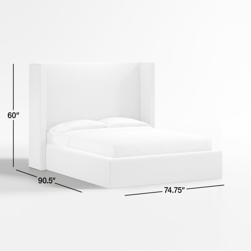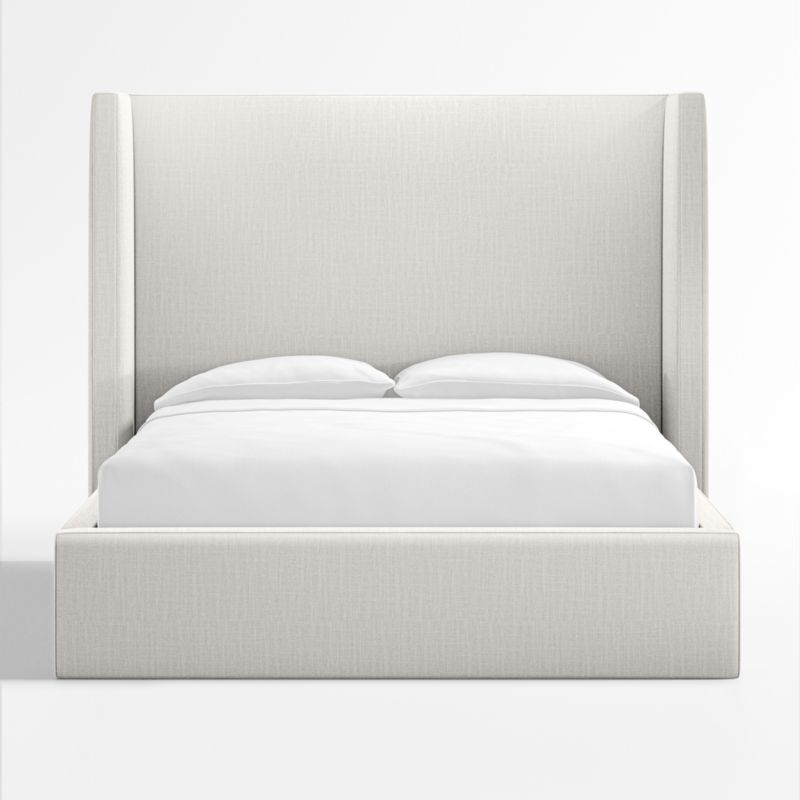Our Arden bed shelters you within its luxe, fully upholstered contours. The statuesque headboard squares the traditional wingback silhouette with right angles, accentuating the bed's dramatic proportions and clean lines. Topstitching lends a tailored look to the poly-linen fabric in decor-friendly ivory. The Arden upholstered bed with tall headboard is a Crate & Barrel exclusive.