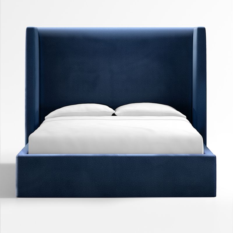 Our Arden bed shelters you within its luxe, fully upholstered contours. The statuesque headboard squares the traditional wingback silhouette with right angles, accentuating the bed's dramatic proportions and clean lines. Topstitching lends a tailored look to the soft, mohair-like fabric in navy blue. The Arden upholstered bed with tall headboard is a Crate & Barrel exclusive.