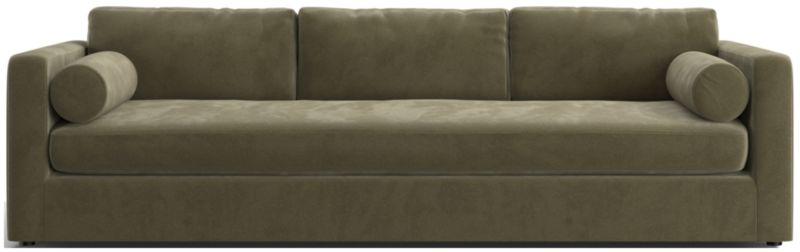 Destined to be everyone's favorite spot to chill, Aris makes modern design soft and cozy. Neat track arms and a broad deck establish the grand-sized sofa's clean lines, while the plush bench seat and back cushions invite the gang to get comfortable. A couple of bolster pillows aid in getting the snuggle just right. The Aris sofa is a Crate & Barrel exclusive.