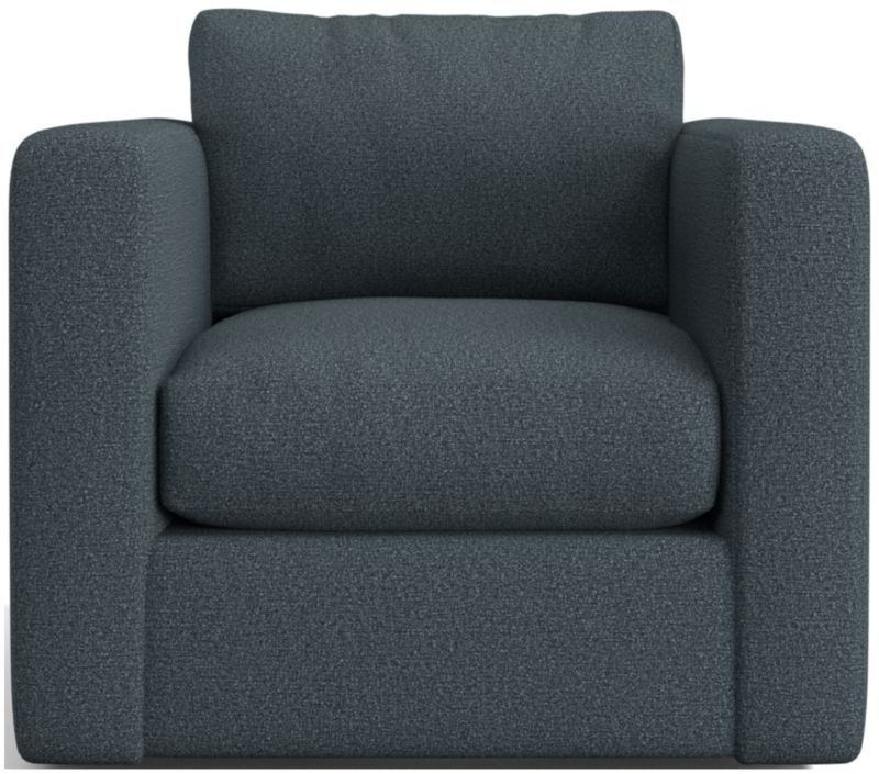 Destined to be everyone's favorite spot to chill, our Aris swivel chair makes modern design soft and cozy. Neat track arms and a broad deck establish the chair's clean lines, while the plush seat and back cushions ensure a comfy stay. The Aris wedge chair is a Crate & Barrel exclusive.