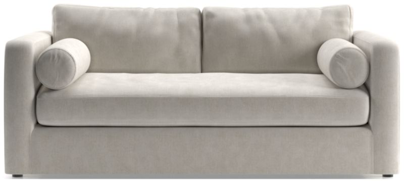 Destined to be everyone's favorite spot to chill, Aris makes modern design soft and cozy. Neat track arms and a broad deck establish the apartment sofa's clean lines, while the plush bench seat and back cushions invite the gang to get comfortable. A couple of bolster pillows aid in getting the snuggle just right. A great choice for small spaces, the Aris apartment sofa is a Crate & Barrel exclusive.