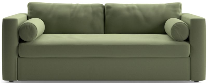 Destined to be everyone's favorite spot to chill, Aris makes modern design soft and cozy. Neat track arms and a broad deck establish the sofa's clean lines, while the plush seat and back cushions invite the gang to get comfortable. A couple of bolster pillows aid in getting the snuggle just right. This comfy queen sleeper sofa features a comfortable mattress and locking tilt-up headrest for reading and media viewing. The Aris Queen Sleeper sofa is a Crate & Barrel exclusive.