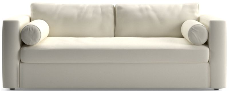 Destined to be everyone's favorite spot to chill, Aris makes modern design soft and cozy. Neat track arms and a broad deck establish the sofa's clean lines, while the plush seat and back cushions invite the gang to get comfortable. A couple of bolster pillows aid in getting the snuggle just right. This comfy queen sleeper sofa features a comfortable mattress and locking tilt-up headrest for reading and media viewing. The Aris Queen Sleeper sofa is a Crate & Barrel exclusive.