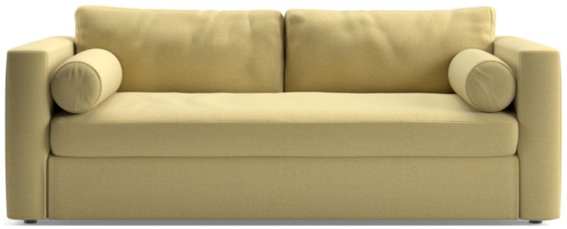 Destined to be everyone's favorite spot to chill, Aris makes modern design soft and cozy. Neat track arms and a broad deck establish the sofa's clean lines, while the plush seat and back cushions invite the gang to get comfortable. A couple of bolster pillows aid in getting the snuggle just right. This comfy queen sleeper sofa features a comfortable mattress and locking tilt-up headrest for reading and media viewing. The Aris Queen Sleeper sofa is a Crate & Barrel exclusive.