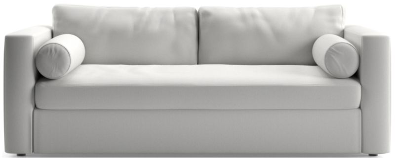 Destined to be everyone's favorite spot to chill, Aris makes modern design soft and cozy. Neat track arms and a broad deck establish the sofa's clean lines, while the plush seat and back cushions invite the gang to get comfortable. A couple of bolster pillows aid in getting the snuggle just right. This comfy queen sleeper sofa features a comfortable mattress and locking tilt-up headrest for reading and media viewing. The Aris Queen Sleeper sofa is a Crate & Barrel exclusive.