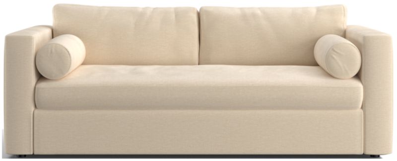 Destined to be everyone's favorite spot to chill, Aris makes modern design soft and cozy. Neat track arms and a broad deck establish the sofa's clean lines, while the plush seat and back cushions invite the gang to get comfortable. A couple of bolster pillows aid in getting the snuggle just right. This comfy queen sleeper sofa features a comfortable mattress and locking tilt-up headrest for reading and media viewing. The Aris Queen Sleeper sofa is a Crate & Barrel exclusive.