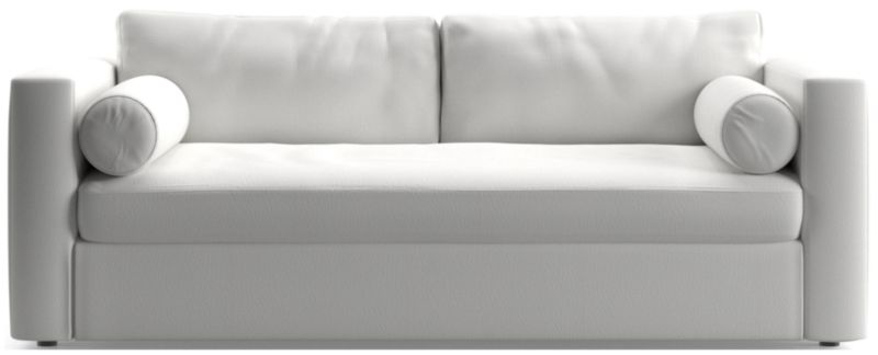Destined to be everyone's favorite spot to chill, Aris makes modern design soft and cozy. Neat track arms and a broad deck establish the sofa's clean lines, while the plush seat and back cushions invite the gang to get comfortable. A couple of bolster pillows aid in getting the snuggle just right. This comfy queen sleeper sofa features a comfortable mattress and locking tilt-up headrest for reading and media viewing. The Aris Queen Sleeper sofa is a Crate & Barrel exclusive.