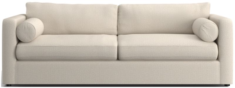Destined to be everyone's favorite spot to chill, Aris makes modern design soft and cozy. Neat track arms and a broad deck establish the sofa's clean lines, while plush seat and back cushions invite the gang to get comfortable. A couple of bolster pillows aid in getting the snuggle just right.