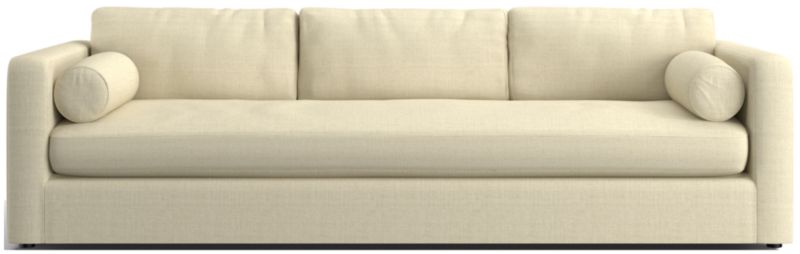 Destined to be everyone's favorite spot to chill, Aris makes modern design soft and cozy. Neat track arms and a broad deck establish the grand-sized sofa's clean lines, while the deep bench seat and back cushions invite the gang to get comfortable. A couple of bolster pillows aid in getting the snuggle just right. The Aris deep-seated sofa is a Crate & Barrel exclusive.
