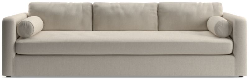 Destined to be everyone's favorite spot to chill, Aris makes modern design soft and cozy. Neat track arms and a broad deck establish the grand-sized sofa's clean lines, while the deep bench seat and back cushions invite the gang to get comfortable. A couple of bolster pillows aid in getting the snuggle just right. The Aris deep-seated sofa is a Crate & Barrel exclusive.