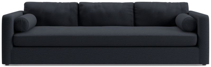Destined to be everyone's favorite spot to chill, Aris makes modern design soft and cozy. Neat track arms and a broad deck establish the grand-sized sofa's clean lines, while the deep bench seat and back cushions invite the gang to get comfortable. A couple of bolster pillows aid in getting the snuggle just right. The Aris deep-seated sofa is a Crate & Barrel exclusive.