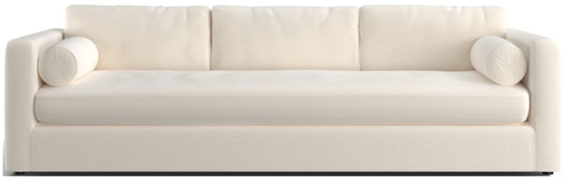 Destined to be everyone's favorite spot to chill, Aris makes modern design soft and cozy. Neat track arms and a broad deck establish the grand-sized sofa's clean lines, while the deep bench seat and back cushions invite the gang to get comfortable. A couple of bolster pillows aid in getting the snuggle just right. The Aris deep-seated sofa is a Crate & Barrel exclusive.