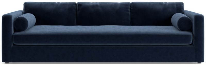 Destined to be everyone's favorite spot to chill, Aris makes modern design soft and cozy. Neat track arms and a broad deck establish the grand-sized sofa's clean lines, while the deep bench seat and back cushions invite the gang to get comfortable. A couple of bolster pillows aid in getting the snuggle just right. The Aris deep-seated sofa is a Crate & Barrel exclusive.
