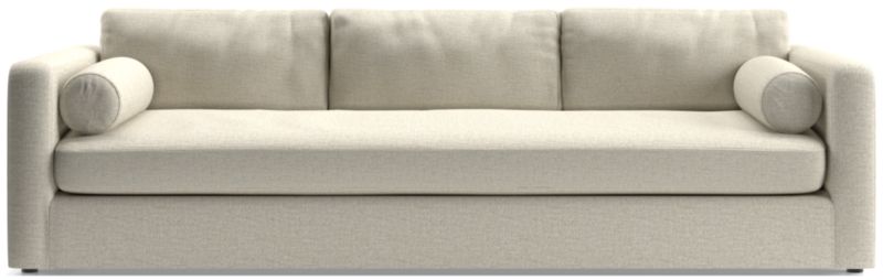 Destined to be everyone's favorite spot to chill, Aris makes modern design soft and cozy. Neat track arms and a broad deck establish the grand-sized sofa's clean lines, while the deep bench seat and back cushions invite the gang to get comfortable. A couple of bolster pillows aid in getting the snuggle just right. The Aris deep-seated sofa is a Crate & Barrel exclusive.
