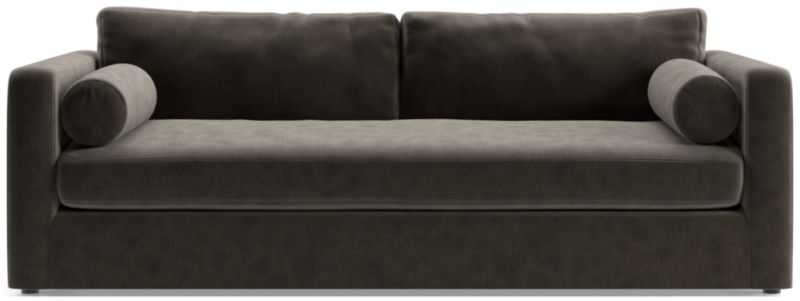 Destined to be everyone's favorite spot to chill, Aris makes modern design soft and cozy. Neat track arms and a broad deck establish the sofa's clean lines, while the deep bench seat and back cushions invite the gang to get comfortable. A couple of bolster pillows aid in getting the snuggle just right. The Aris deep-seated sofa is a Crate & Barrel exclusive.