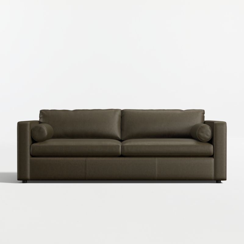 Aris makes modern design soft, cozy and indulgent, upholstered in top-grain leather with rich color and buttery softness. Destined to be everyone's favorite spot to chill, clean-lined Aris features track arms and a broad deck with deep seat and plush back cushions that invite the gang to get comfortable. A couple of bolster pillows aid in getting the snuggle just right.