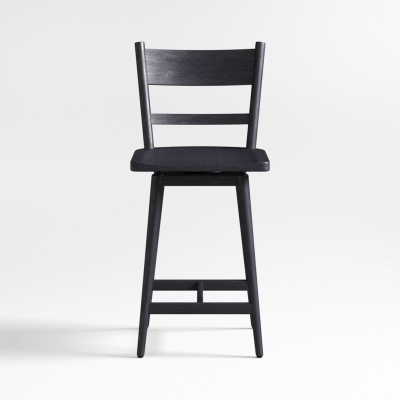 Arno's easy charm lies in its subtle design details. The slightest curve to the stool's slat back provides back support, while the sculpted seat ensures a comfortable sit at a counter or high dining table. A 180° swivel allows easy movement with a return mechanism that returns the seat to its original to keep the look tidy. Wirebrushing and an ebonized black finish call out the grain of this versatile hardwood counter stool, exclusive to Crate & Barrel.