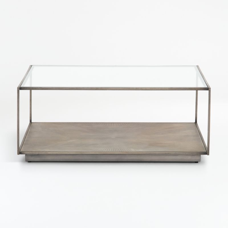 Our Array coffee table evokes the dreamy opulence of Hollywood Regency style. Retro-inspired yet totally of the moment, the glass-topped table gives a clear view of the lower shelf etched with a starburst of lines and finished in vintage brass. Designed as a scaled-up shadowbox with a chic plinth base, the coffee table invites displays of prized possessions with an open frame of nickel-finished iron.