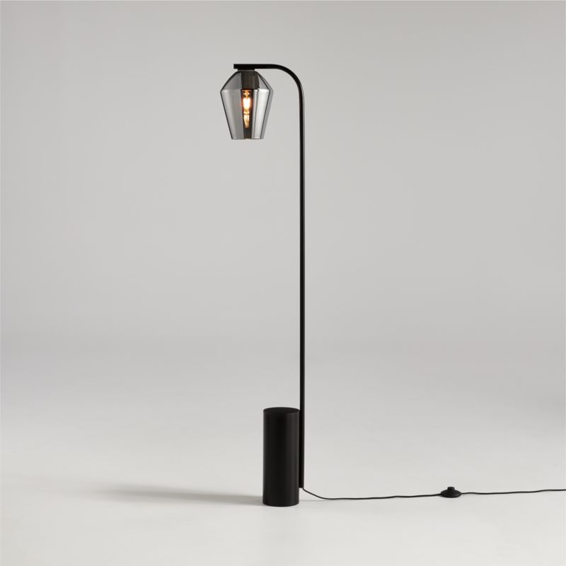 A column of black iron provides a bold and grounding base for our Arren floor lamp. Bending gracefully at curved corners, a black rod suspends a softly angled, silver glass shade. Boasting clean lines and balanced proportions, the lamp creates striking illumination above a sofa or next to an armchair. This floor lamp is designed by Mark Daniel of Slate Design exclusively for us as part of our Arren collection of flexible lighting options with a custom feel.