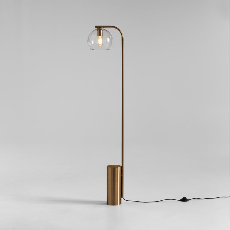 A column of brass provides a gleaming and grounding base for our Arren floor lamp. Bending gracefully at curved corners, brass-finished rod suspends a rounded, clear glass shade. Boasting clean lines and balanced proportions, the lamp creates striking illumination above a sofa or next to an armchair. This floor lamp is designed by Mark Daniel of Slate Design exclusively for us as part of our Arren collection of flexible lighting options with a custom feel.