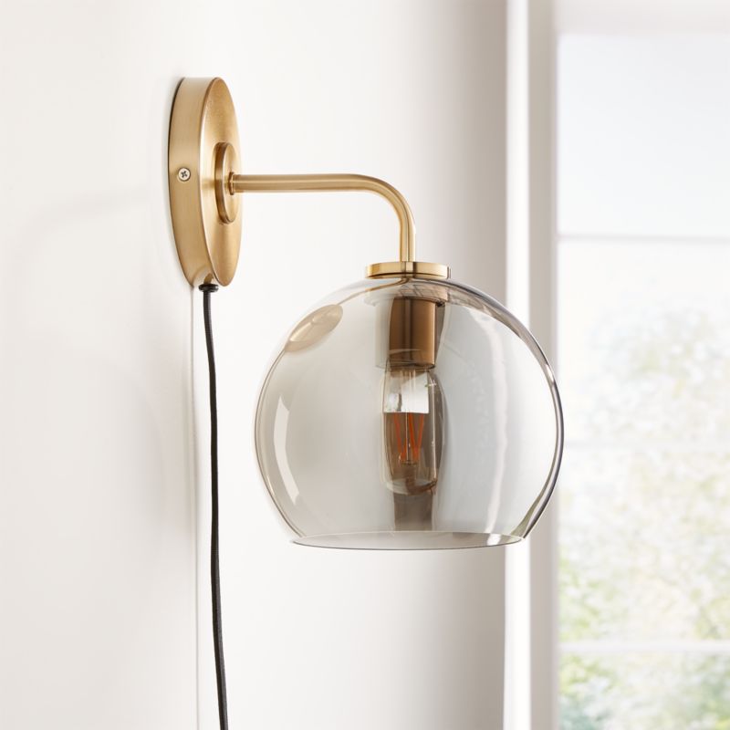 A round, silver glass shade contrasts compellingly with an iron base finished in gleaming brass, for a sleek wall sconce at once modern and timeless. Bending gracefully from the wall, the slim-armed sconce can be positioned up or down, while the black fabric cord makes installing the Arren Brass Wall Sconce with Silver Round Shade a breeze. Our Arren collection combines single- and multi-bulb ceiling lights and sconces in a variety of configurations and finishes with elegant glass shades available in three shapes and three finishes. Install a pair of sconces flanking your buffet, a matching five-light pendant over the dining table and single pendant above the bar cart, or scatter coordinating light fixtures throughout your home for a modern mixed-materials look. Designed by Mark Daniel of Slate Design exclusively for us, this plug-in sconce is part of our Arren collection of flexible lighting options with a custom feel.
