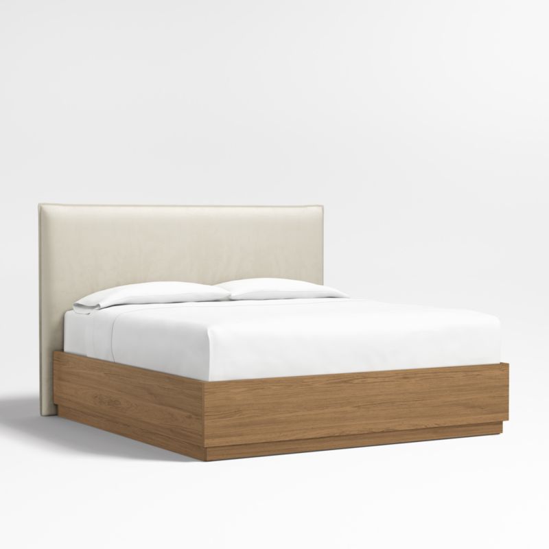 Our custom bed collection lets you mix and match our top-selling headboards and bases for a look that's truly yours. Upholstered in beige faux mohair with a casual flange border, our coastal-cool Arvada headboard offers pillow-like comfort. The Batten bed base complements Arvada's clean yet relaxed silhouette with a sleek plinth design and the lively grain of oak veneer enhanced with a smoke grey finish. A great choice for storage-challenged bedrooms, Batten seamlessly integrates a drawer at the foot of the base for placing bedding, blankets and out-of-season garments.