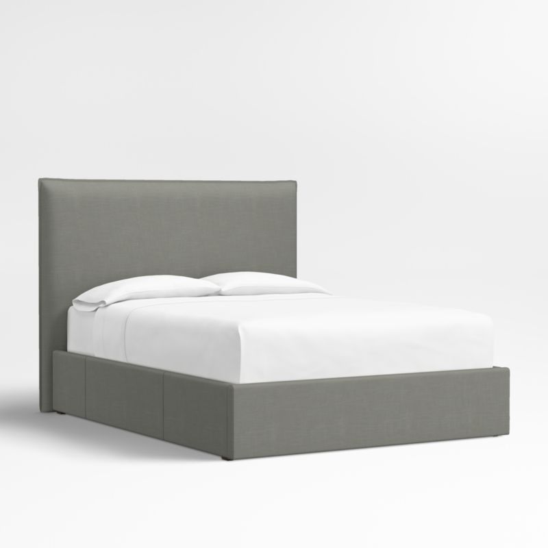 Our custom bed collection lets you mix and match our top-selling headboards and bases for a look that's truly yours. Our coastal-cool Arvada headboard offers pillow-like comfort and the casual look of a relaxed flange border, while the base integrates three roomy drawers—one on each side and one at the foot of the bed—for storing off-season clothes and extra blankets. As a plus, the side drawers open with just enough clearance to avoid hitting nightstands and other bedroom furniture. Both pieces are upholstered in a graphite grey linen blend.