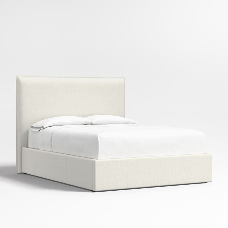 Our custom bed collection lets you mix and match our top-selling headboards and bases for a look that's truly yours. Our coastal-cool Arvada headboard offers pillow-like comfort and the casual look of a relaxed flange border, while the base integrates three roomy drawers—one on each side and one at the foot of the bed—for storing off-season clothes and extra blankets. As a plus, the side drawers open with just enough clearance to avoid hitting nightstands and other bedroom furniture. Both headboard and base are upholstered in a textured weave in ivory.