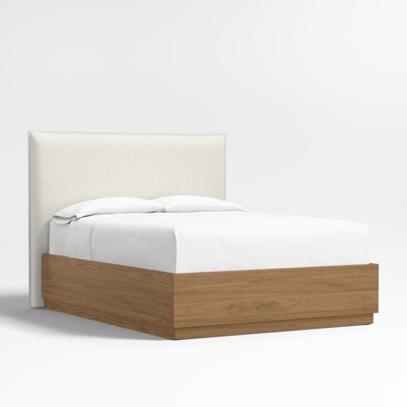 Our custom bed collection lets you mix and match our top-selling headboards and bases for a look that's truly yours. Upholstered in an ivory textured weave with a casual flange border, our coastal-cool Arvada headboard offers pillow-like comfort. The Batten bed base complements Arvada's clean yet relaxed silhouette with a sleek plinth design and the lively grain of oak veneer enhanced with a smoke grey finish. A great choice for storage-challenged bedrooms, Batten seamlessly integrates a drawer at the foot of the base for placing bedding, blankets and out-of-season garments.