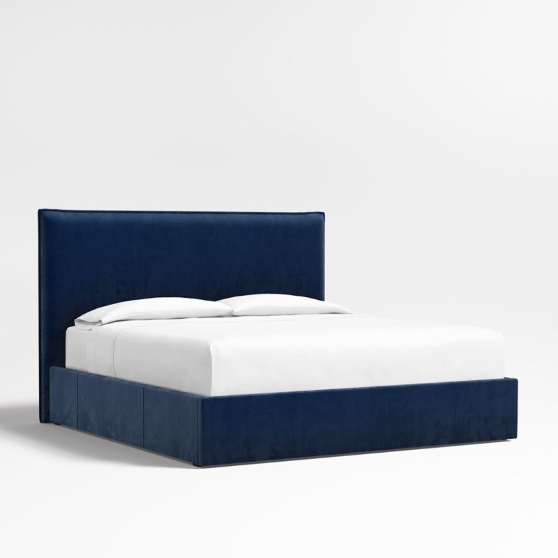 Our custom bed collection lets you mix and match our top-selling headboards and bases for a look that's truly yours. Our coastal-cool Arvada headboard offers pillow-like comfort and the casual look of a relaxed flange border, while the base integrates three roomy drawers—one on each side and one at the foot of the bed—for storing off-season clothes and extra blankets. As a plus, the side drawers open with just enough clearance to avoid hitting nightstands and other bedroom furniture. Both pieces are upholstered in navy blue faux mohair.