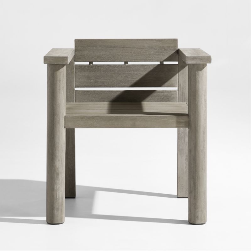 Our Ashore dining collection brings coastal cool to your deck or patio. Made of solid mahogany, the dining chair gets its oceanside look from heavy wirebrushing and a grey wash finish that plays up the grain and gives it a weathered-driftwood vibe. A mix of dowel and slab legs give the chair an eclectic look, while the planked armrests and slatted seat and back shape its clean lines and square silhouette. Add boxy white seat and back cushions (sold separately) covered in weather-resistant polyester for plush comfort. The Ashore outdoor dining chair is a Crate & Barrel exclusive.