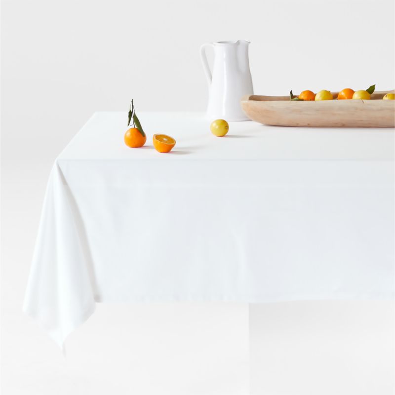 Our Aspen linens set the table with elegant neutrals and saturated hues. This organic cotton tablecloth in crisp white is perfect for chic dinner parties or weeknight family meals and cleans up easily in the washing machine. Pairing effortlessly with modern dinnerware and decor, our elegant yet easy-care tablecloth is a Crate & Barrel exclusive.