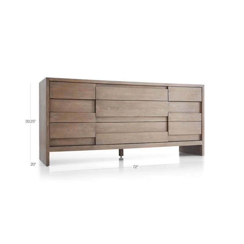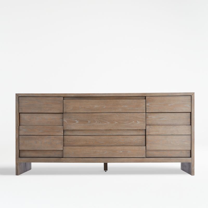 All intriguing lines and grey-washed oak veneer, Atlas pulls it all together in a versatile bedroom collection that builds up or down to suit your style. The soft grey tint highlights the wood's lively grain, bringing even more movement to the dresser's undulating drawer fronts. Designed for us by Blake Tovin of Tovin Design, the Atlas 9-Drawer Dresser is a Crate and Barrel exclusive.