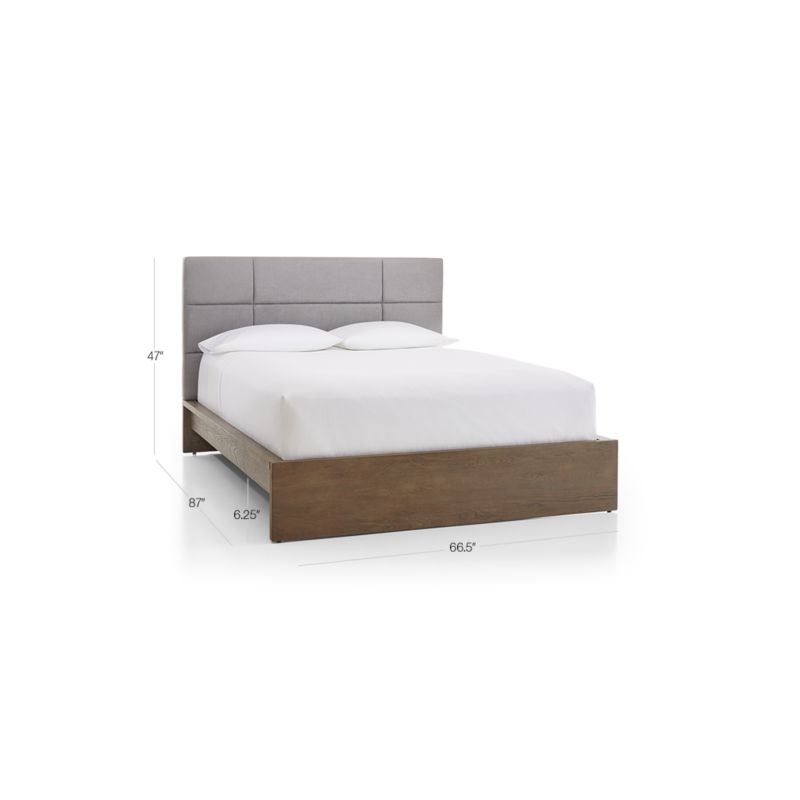 All intriguing lines and grey-washed wood, Atlas is a versatile bedroom collection that builds up or down to suit your style. The bed's clean waterfall frame highlights the lively grain in simple rails and a broad footboard. Complementing the bed's linear look and grey color, the headboard mixes it up with an upholstered design that's neatly tailored with channel detailing. Designed for us by Blake Tovin of Tovin Design, the Atlas Queen Bed is a Crate and Barrel exclusive.