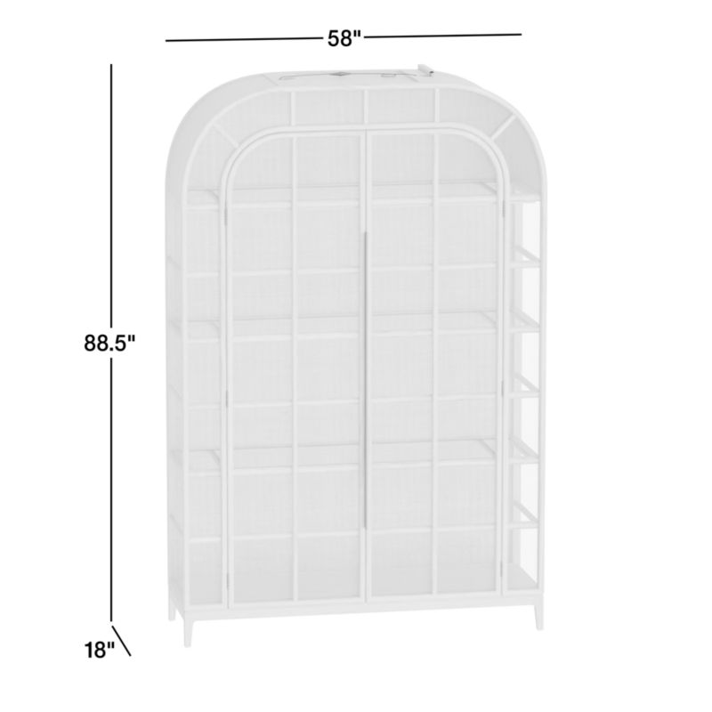 Spied in a vintage Paris apartment, a beautiful arched doorway inspired this stunning cabinet. As its name suggests, Atrium lets in light from three sides with an airy design of paned glass framed by slender grids of rye-tinted white oak. Three wood and glass shelves float collectibles, glassware, dinnerware, art and books against a back panel of woven rattan, with nighttime illumination provided by LED lighting. Don't miss the subtle burnished brass accent provided by the long center door pull.